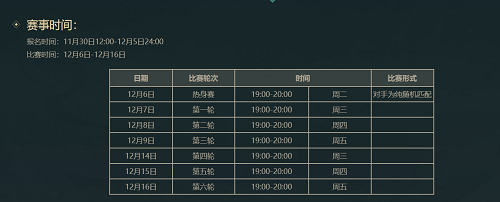 本届团队争霸赛将历时9天。从12月7日起至12月16日,每逢周三、周四、周五晚上的19:00~20:00,玩家可参与共计六轮的积分赛。
